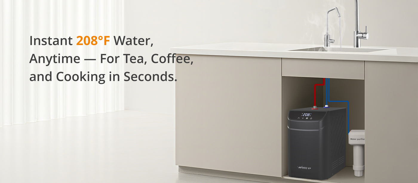 The WINTEMP 2-in-1 Faucet Dispenser delivers 208°F hot water for tea, coffee, or cooking — together with clean filtered water for daily use.