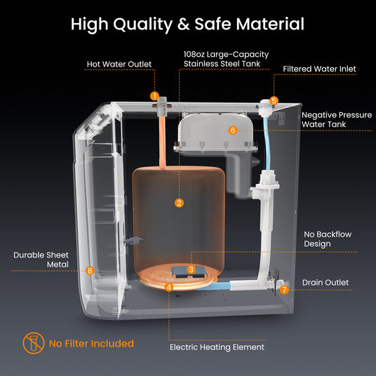 The 108-oz food-grade stainless steel tank prevents scale buildup and preserves fresh water quality. Combined with non-contact heating technology, your water stays clean, hygienic, and safe for everyday use—year after year.