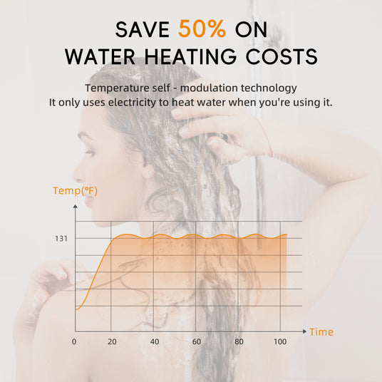 Self-modulating technology adjusts power usage based on water flow, achieving up to 99% energy savings and reducing heating costs by 50%.